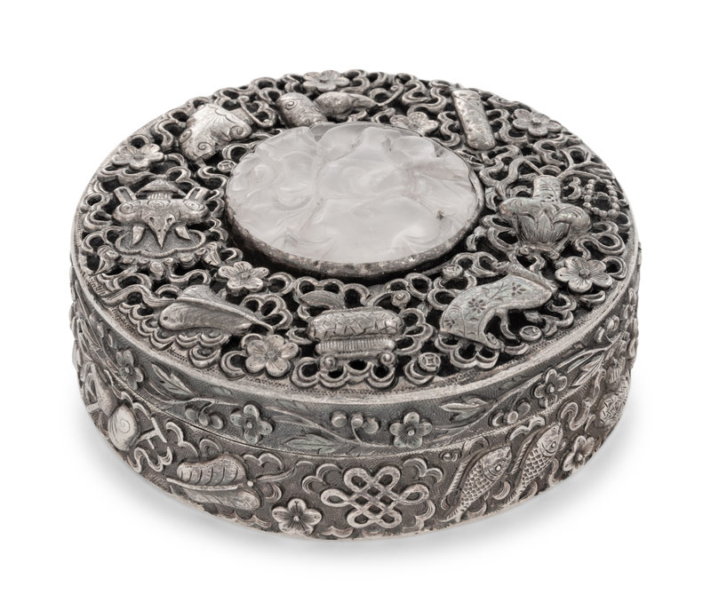 of circular section finely hammered in repousse to show eight auspicious emblems against a floral ground, the cover inset with pale stone carved to show a double gourd; marked 'Made in China' and 'Silver' to the underside.