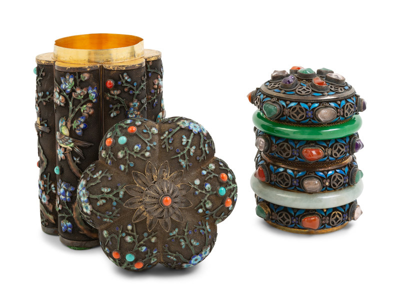 the first of foliate form with a conforming cover terminating in a hardstone mounted finial, enameled with birds resting on flowering branches, and inlaid with hardstone cabochons; the second of cylindrical inset with naturalistic hardstones and a pair of bangles.