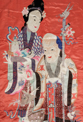 comprising a large coral ground embroidered 'longevity' wall hanging, a red ground embroidered panel, three satin lengths embroidered with floral samples, and one woven example.