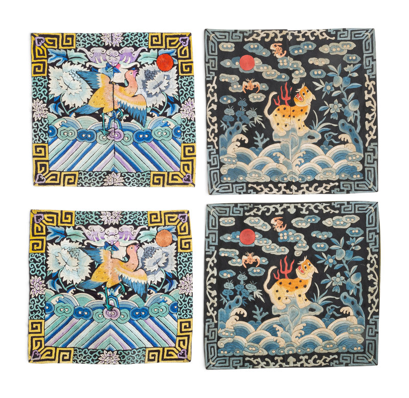 Two Pairs of Chinese Embroidered Silk Rank Badges, Buzi