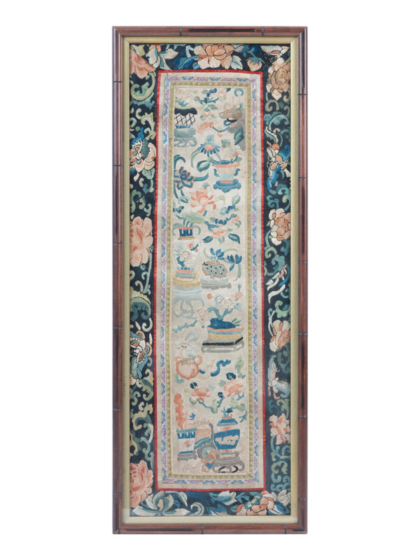 centrally embroidered with various auspicious symbols, vases, flowers, and bats against a beige ground, encircled by blue ground borders, similarly worked; framed and glazed.