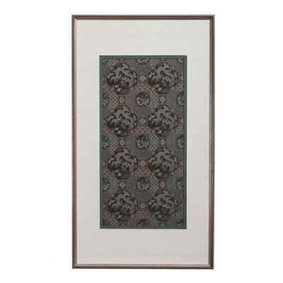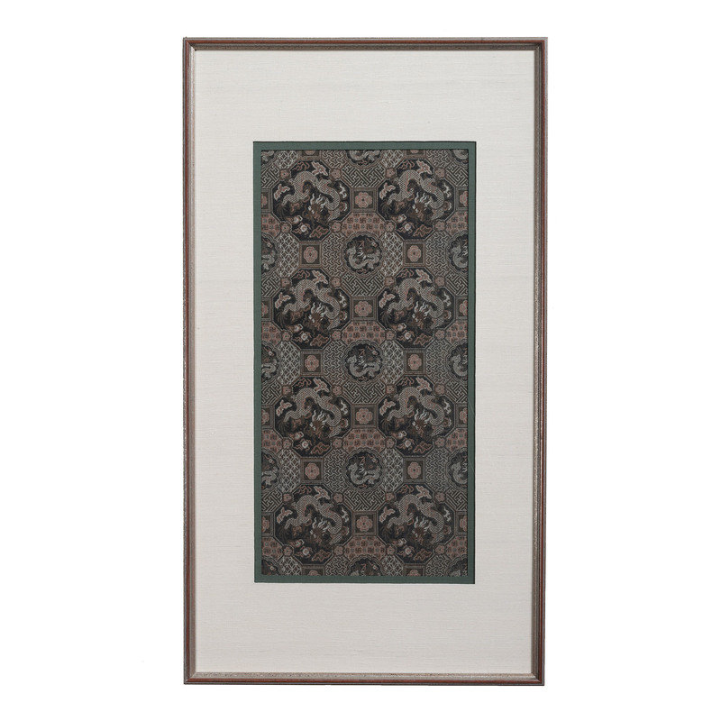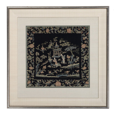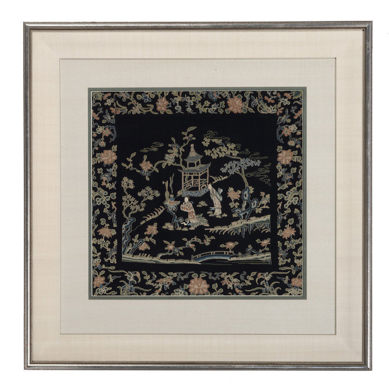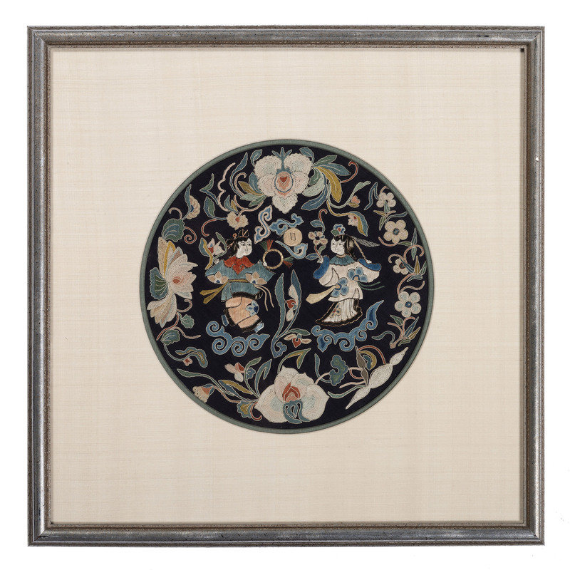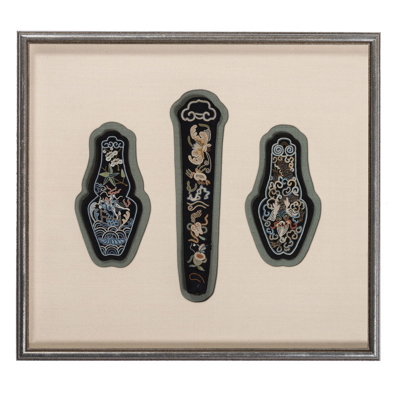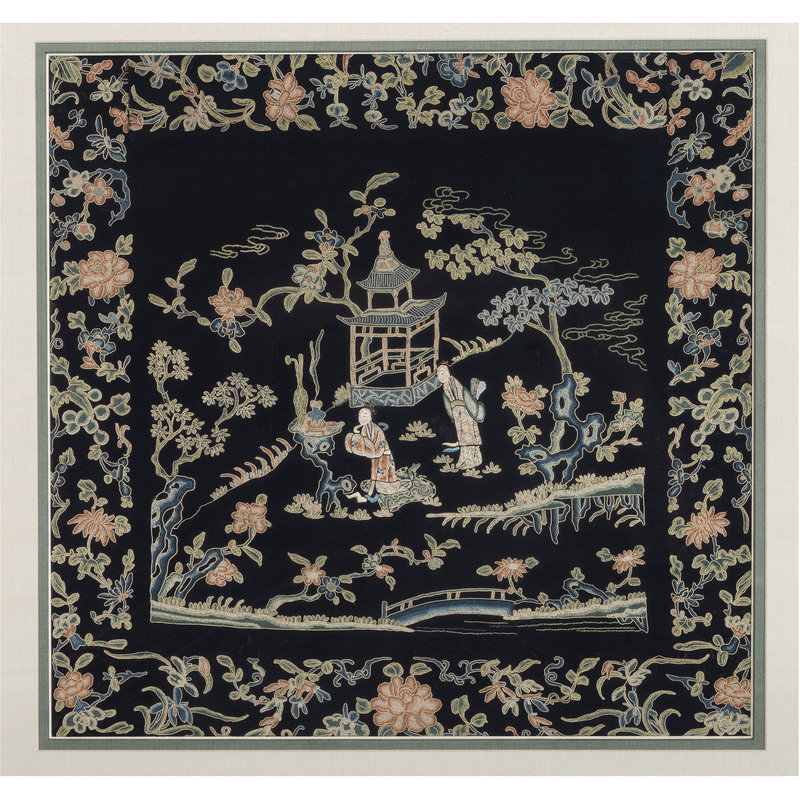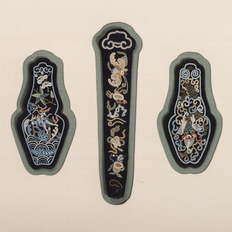 the first a round panel of midnight blue satin embroidered with ladies and couched with gilt threads, the second a square panel of midnight blue satin with needleloop embroidery, the third a rectangular emerald and russet brocade weaving of dragons chasing pearls, the third a set of blue ground needleloop embroidered fan covers.
