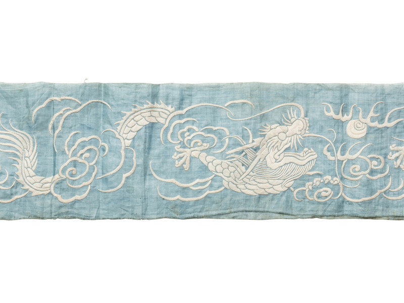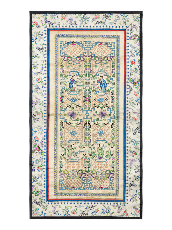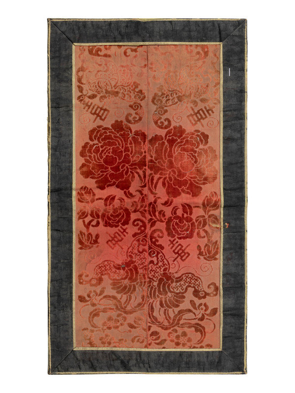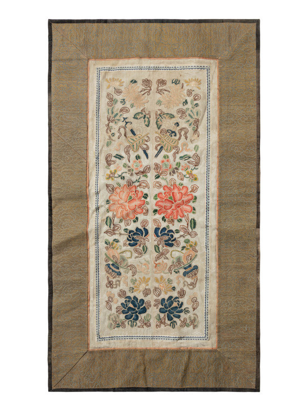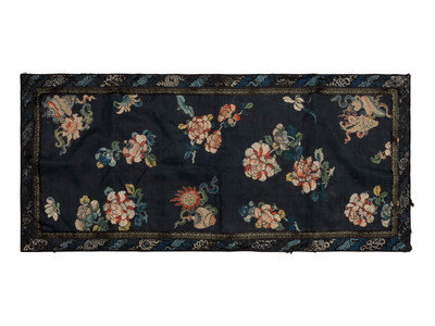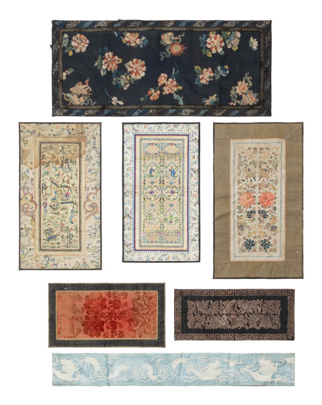 晚清 織繡一組七件each of rectangular form, comprising one velvet example, and six examples embroidered with satin and seed stitches in multicolored and metallic threads to depict various flowering blossoms.