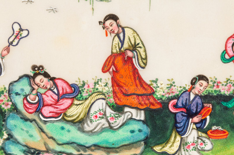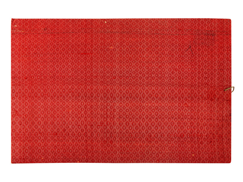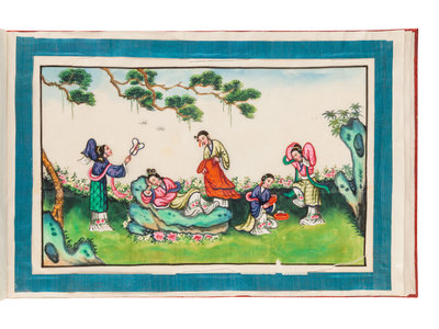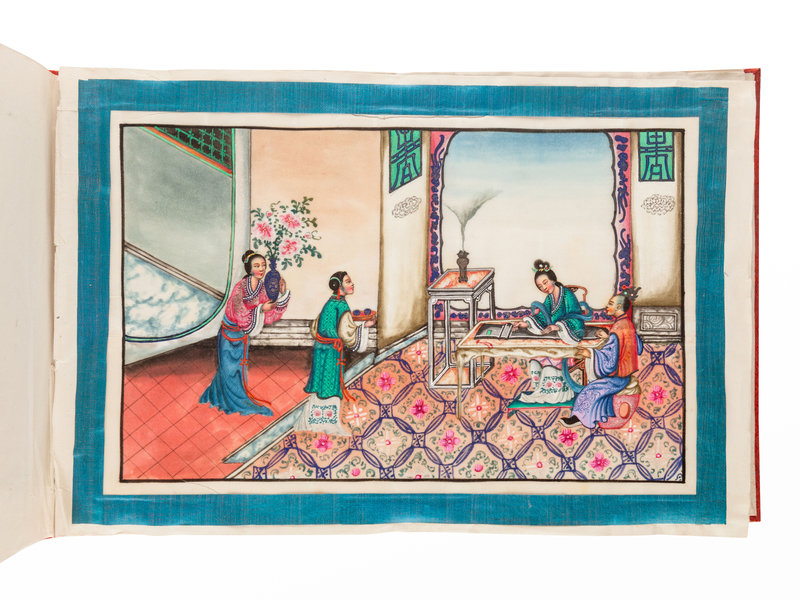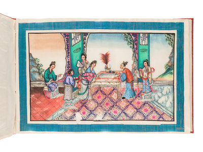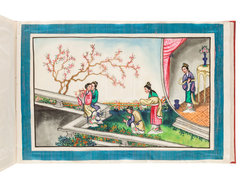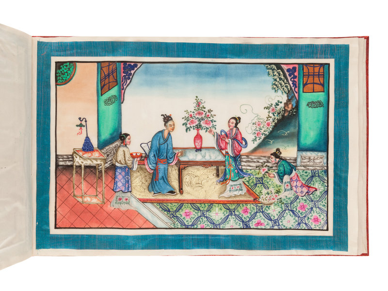 each depicted ladies at leisure, enclosed together in a red silk brocade folio.