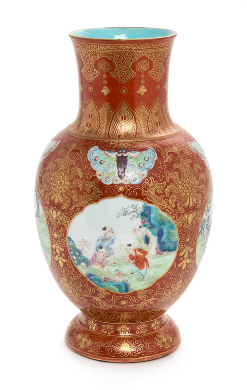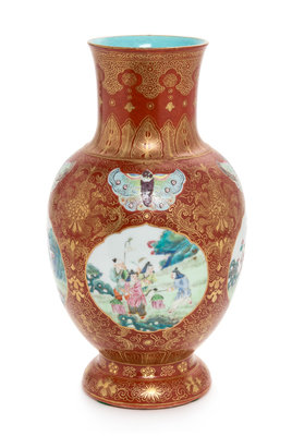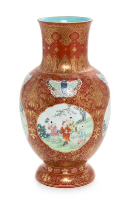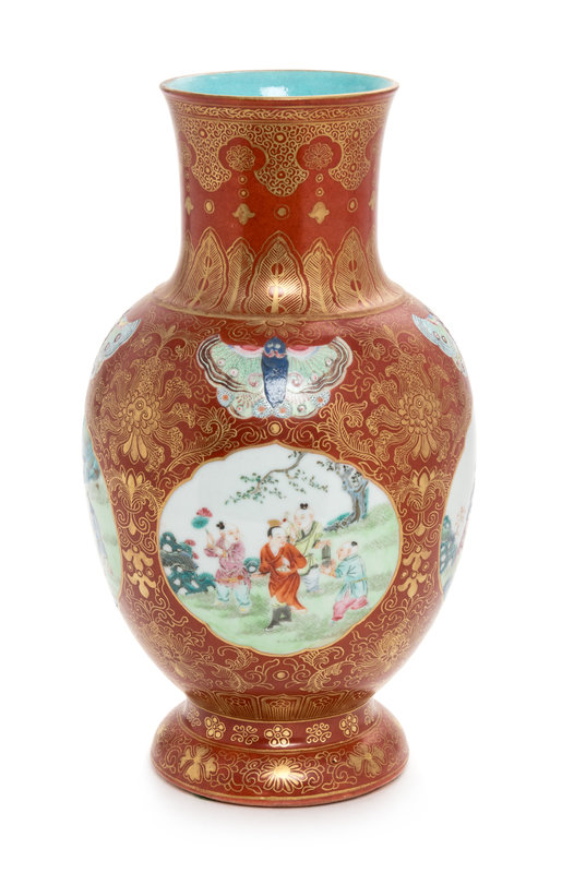 清十八世紀 珊瑚紅地粉彩描金開光嬰戲圖瓶