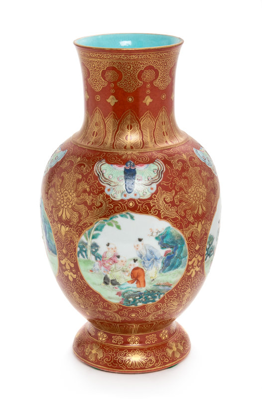 the ovoid body decorated with butterflies at the shoulder and shaped panels enclosing boys at play in a fenced garden, all reserved on a vibrant coral-red ground with gilt decoration.