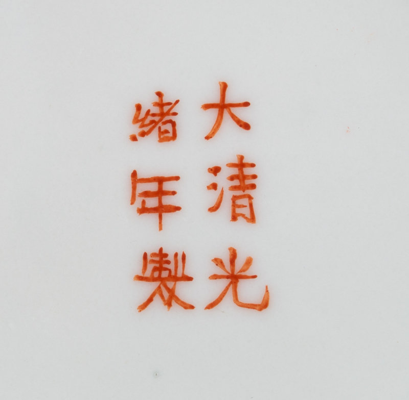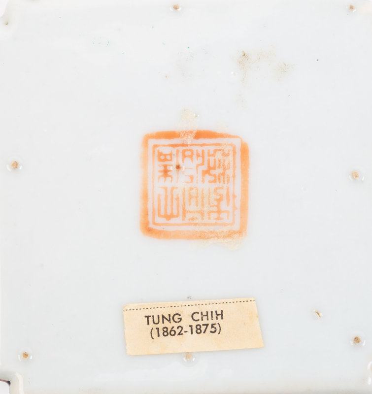 comprising a famille rose covered bowl, a white slip decorated blue ground brush washer, a famille rose square brush washer and a green, russet and yellow glazed covered jar.