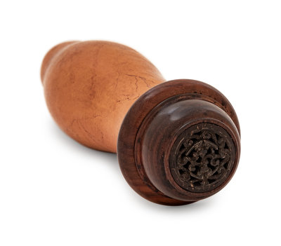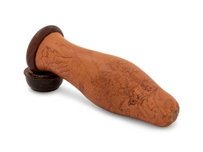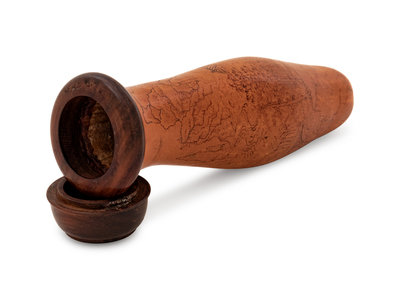 the elongated body incised and painted with a mountainous landscape, having a hardwood cover.