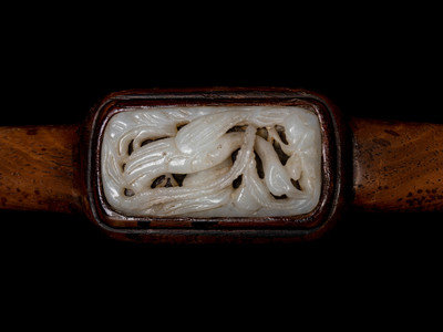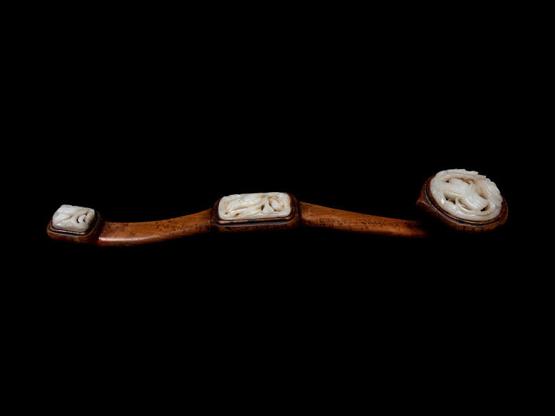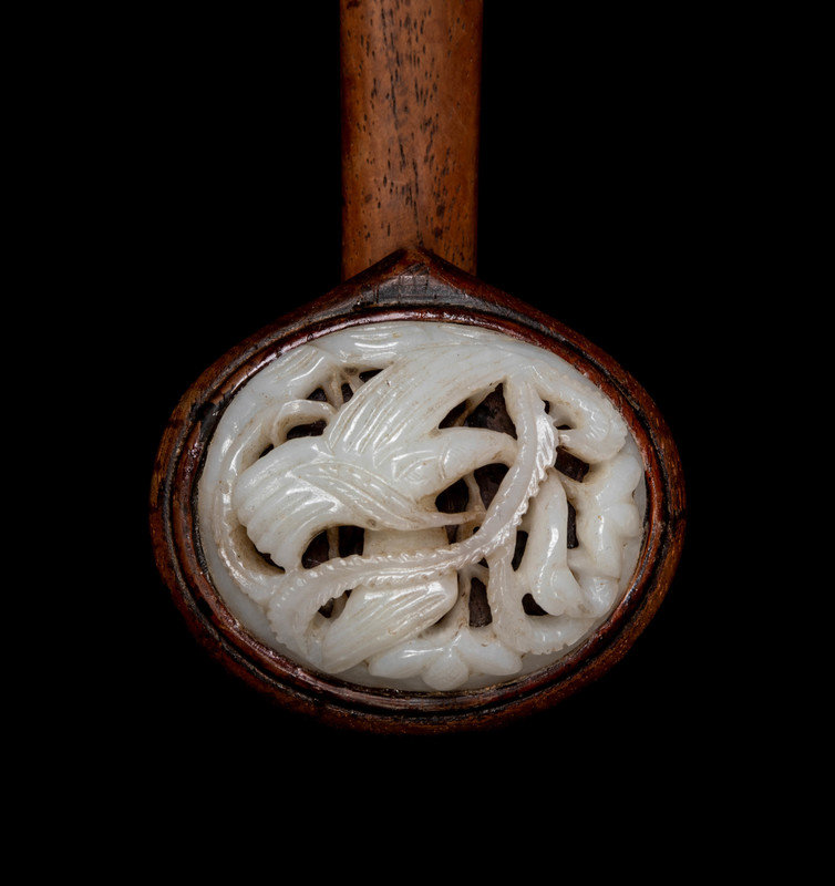 A Chinese White Jade Inset Hardwood Ruyi Scepter