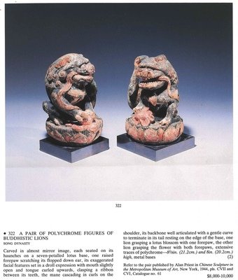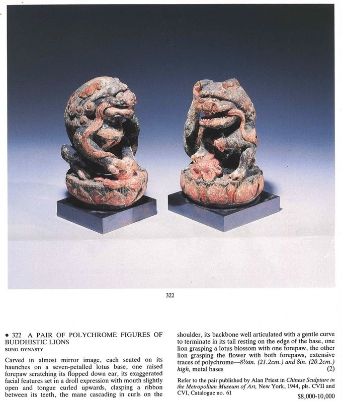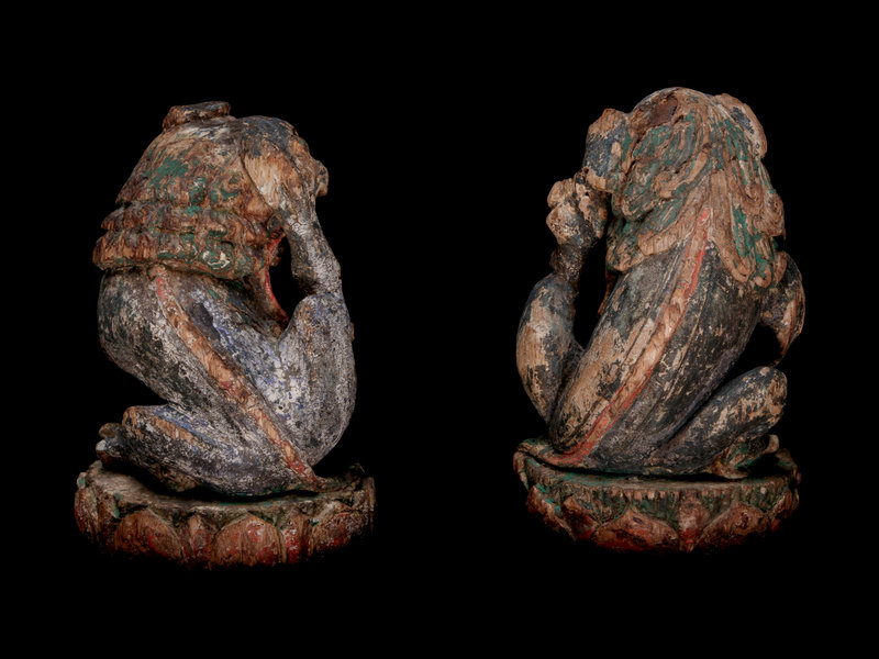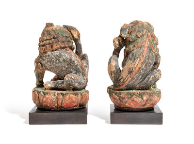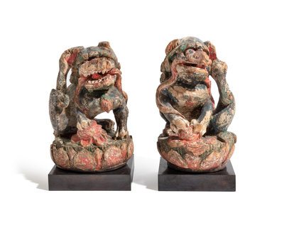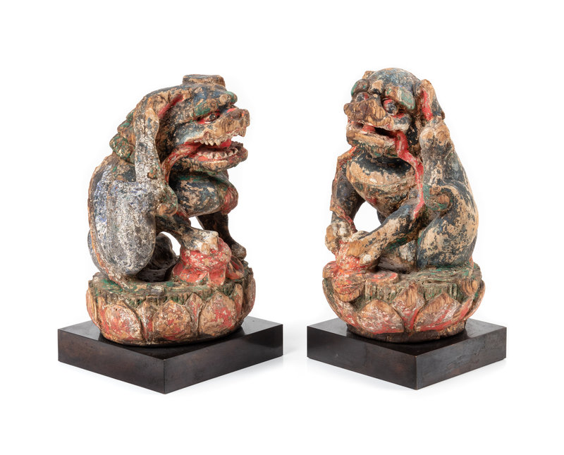 A Pair of Chinese Polychrome Painted Wood Figures of Fu Lions