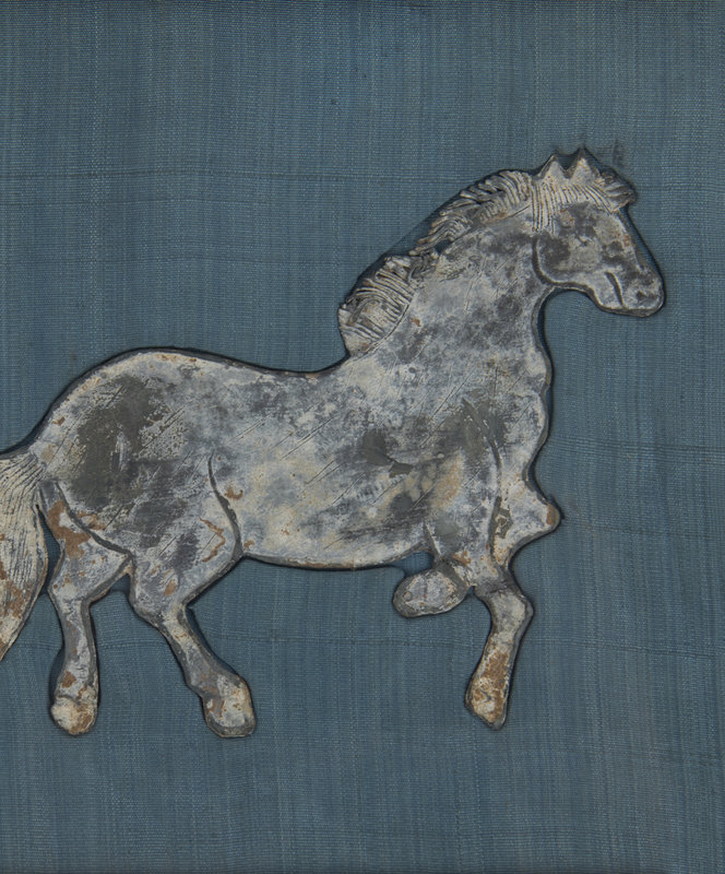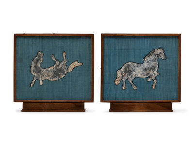 one showing a striding horse, the other a horse lying on its back, each framed.