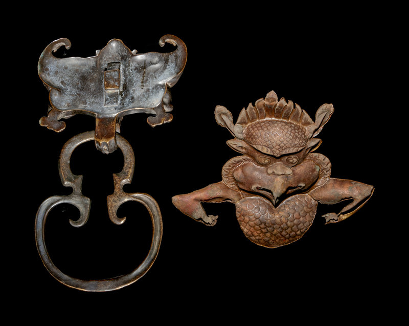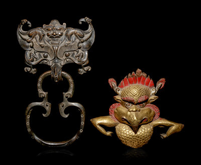 the first a Chinese bronze door handle with a suspended shaped ring, the second a Southeast Asian Gilt Bronze animal-form plaque, with red lacquered headdress.