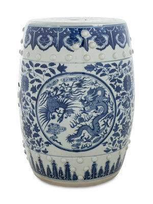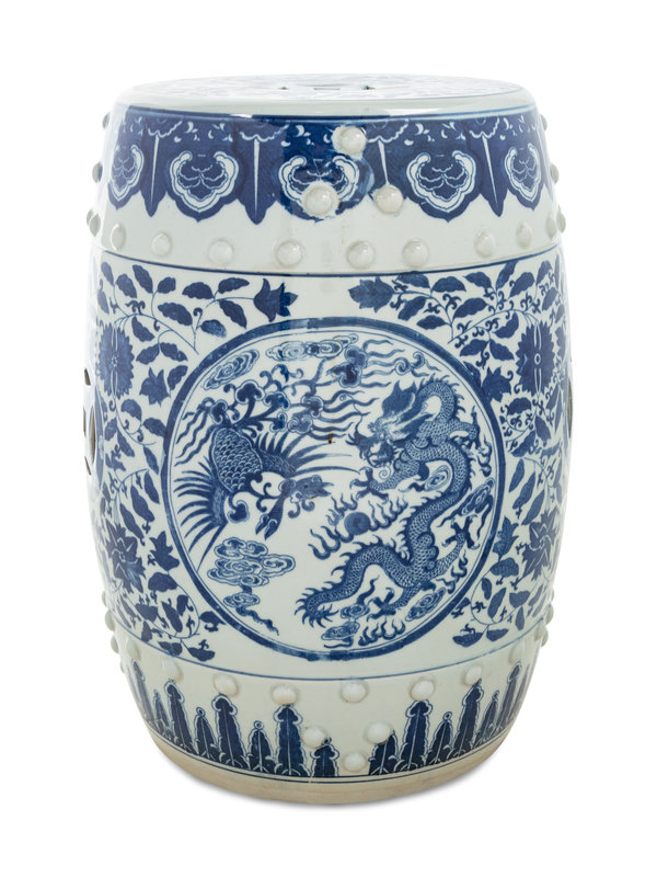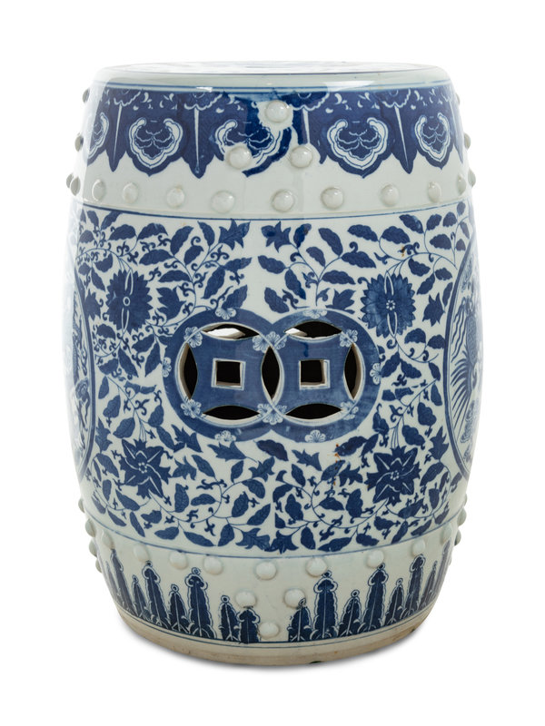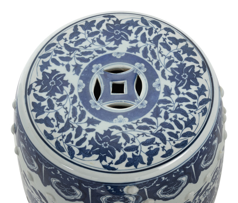 of barrel form, painted with floral blooms born on meandering vines between a band of large ruyi heads and plantain leaves, the top and sides decorated with reticulated double-coin design.