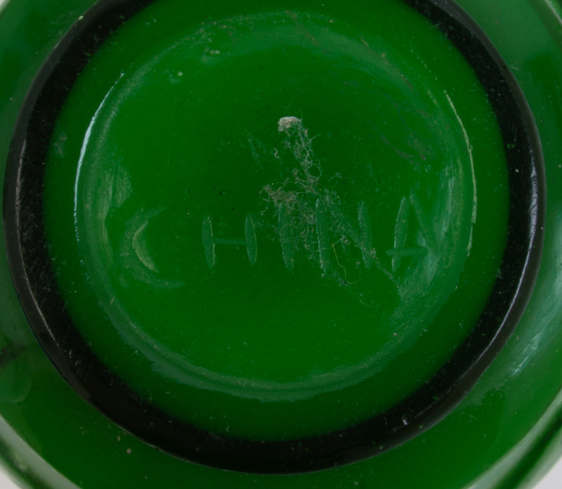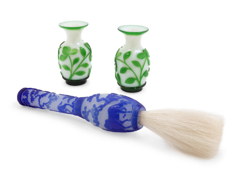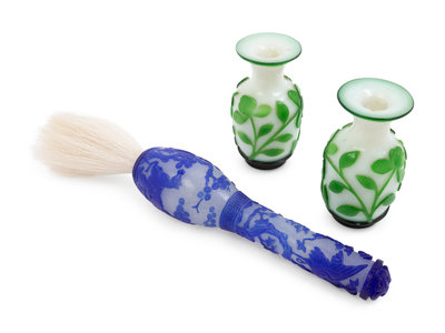 A Pair of Chinese Green Overlay Milky White Glass Vases and A Chinese Blue Overlay Snow Flake Ground Glass Brush Holder