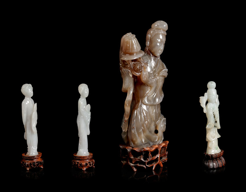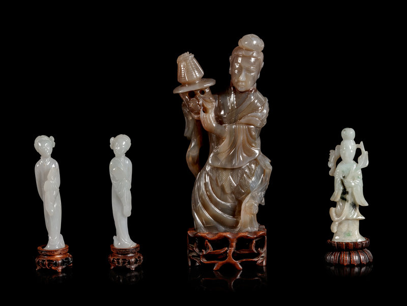 comprising a large agate example of Guanyin, and three small jadeite examples.