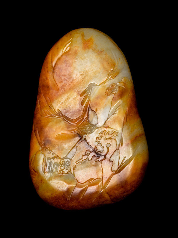 of pebble form, carved to show a figure seated in a rocky mountain.