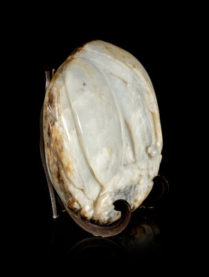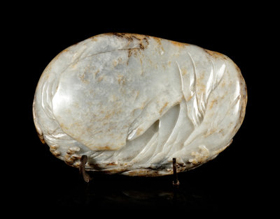 of greyish white tone with russet inclusions, the large oval stone carved to the front to depict a large and round moon above rushing waves, leafy trees to the side and rockwork to the reverse.
