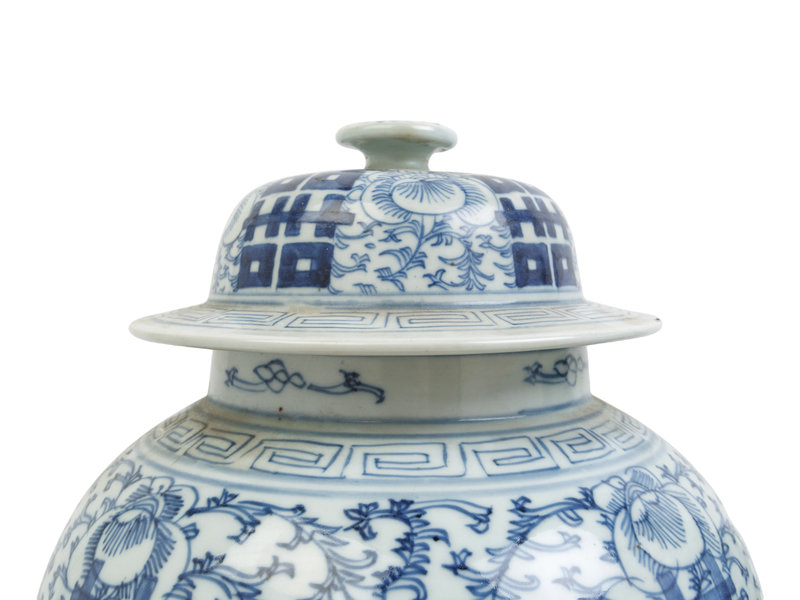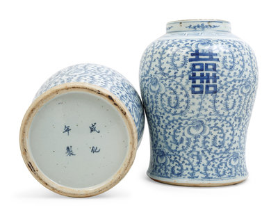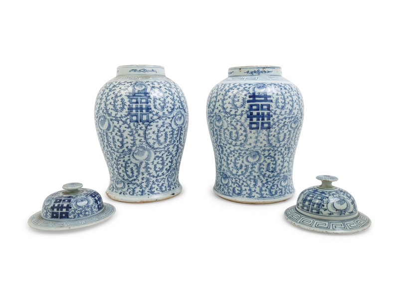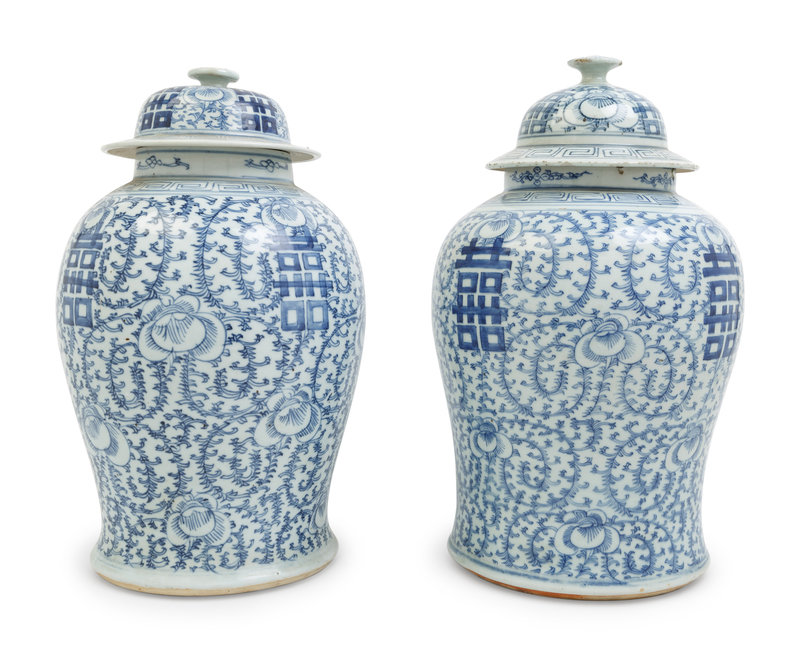 each of baluster form, rising from a gently spreading foot to a broad shoulder, and waisted neck, painted with lotus scrolls and xi characters, the domed cover surmounted by a finial.