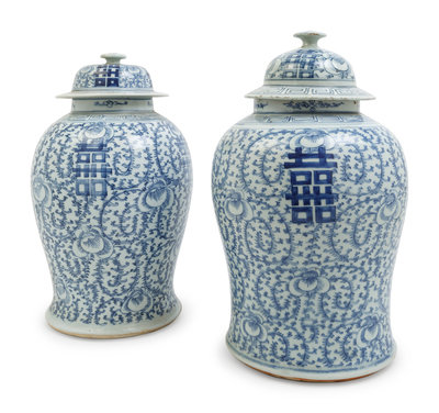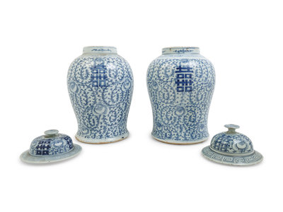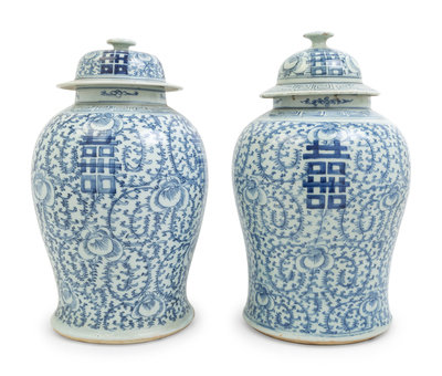A Pair of Chinese Blue and White Porcelain Jars and Covers