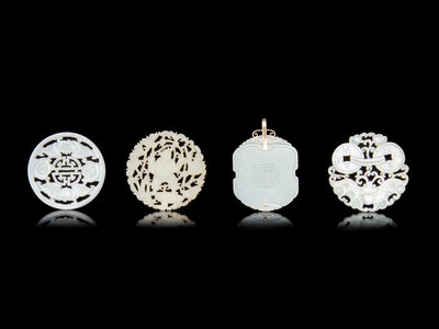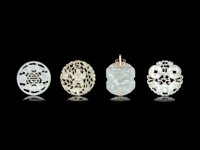 comprising three celadon jade examples, one carved with winged bats and shou characters, one a cat underneath a butterfly, one a bat with coins; a serpentine example showing a boy at play.