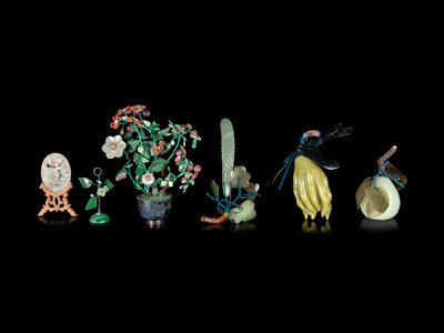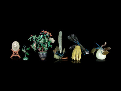 comprising a carving of a pear, a carving of a hand citron, a carving of bitter melons, two jade and hardstone plants and one miniature table screen.