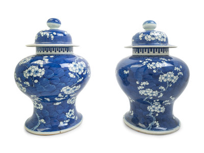 A Pair of Chinese Blue and White Porcelain 'Ice Crackle and Prunus' Baluster Jars and Covers