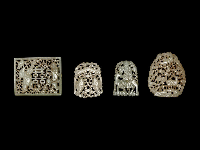 Four Chinese Celadon Jade Reticulated Plaques