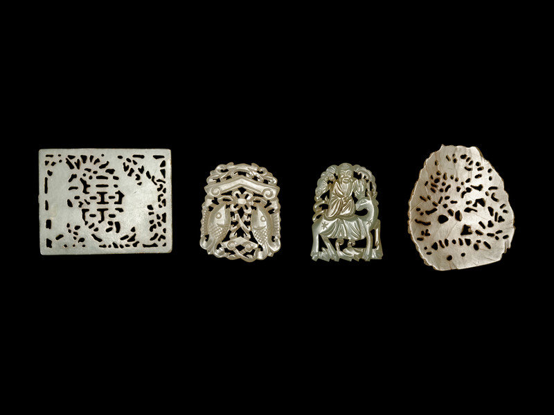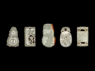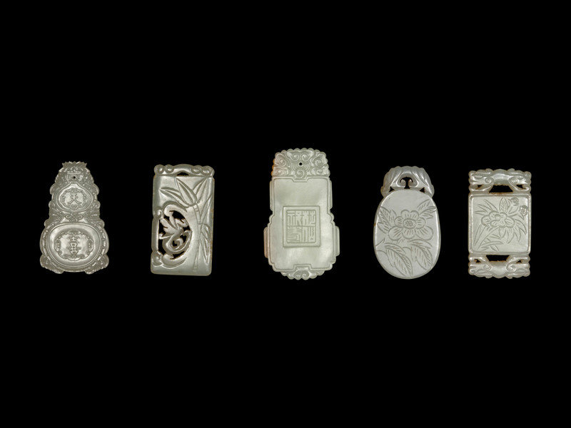 one carved to show a gourd, one bamboo stalks, one lingzhi, two flowering plants.