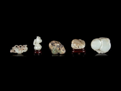 comprising a pale celadon jade carving of double peaches, a pale celadon jade carving of gourds, a celadon and russet jade carving of lingzhi, a mottled celadon jade carving of peaches and a celadon jade carving of blossoming flowers.