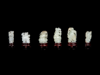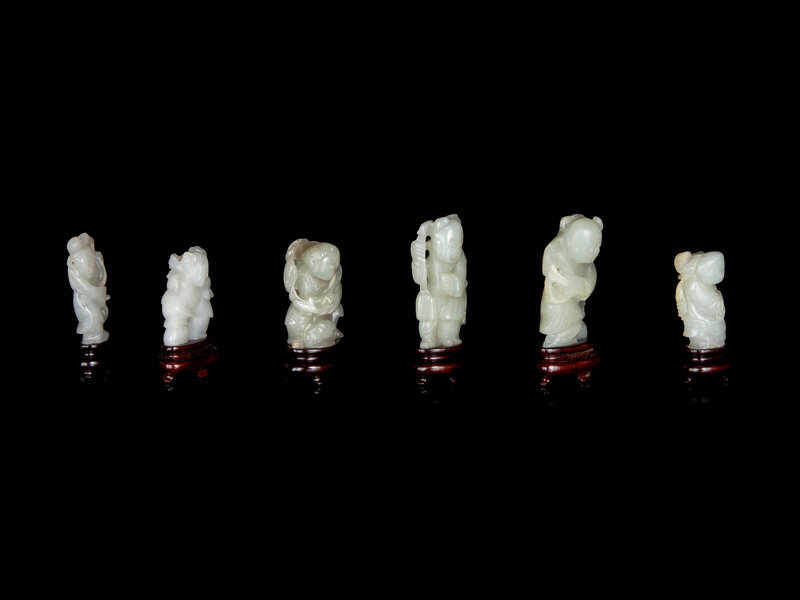 each figure depicted standing, holding large floral sprays, raised on a fitted hardwood stand.