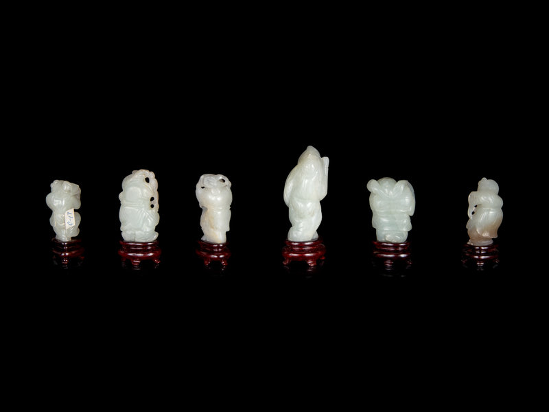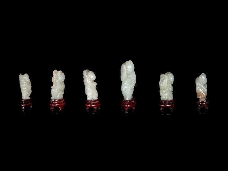 each depicted standing, carrying large floral sprays, raised on a fitted hardwood stand.