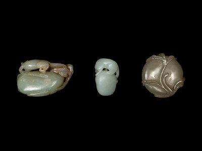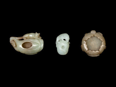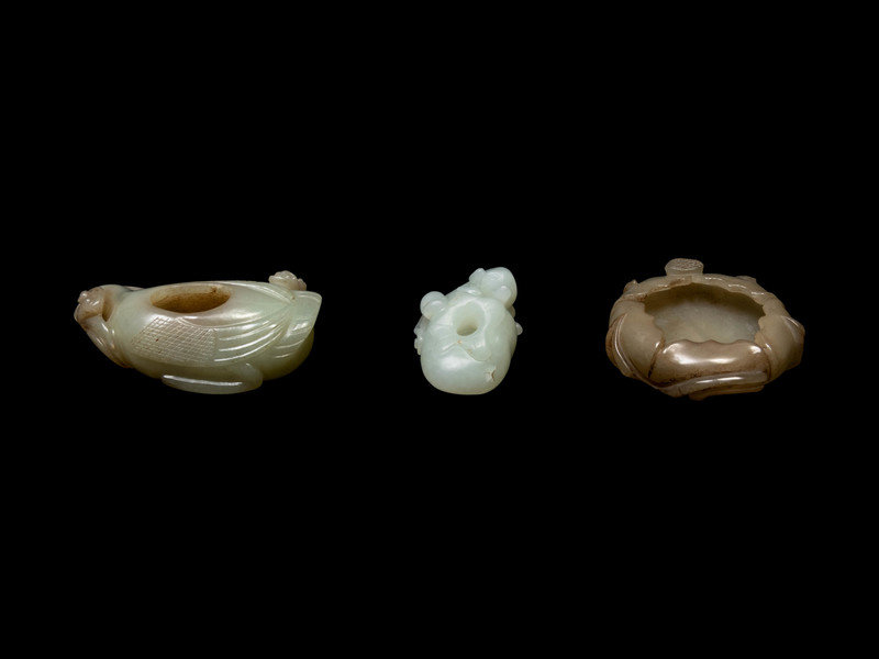 the first a duck-form water coupe, the second a fruit-form water dropper carved with a beast on the side, the third a peach-form brush washer.