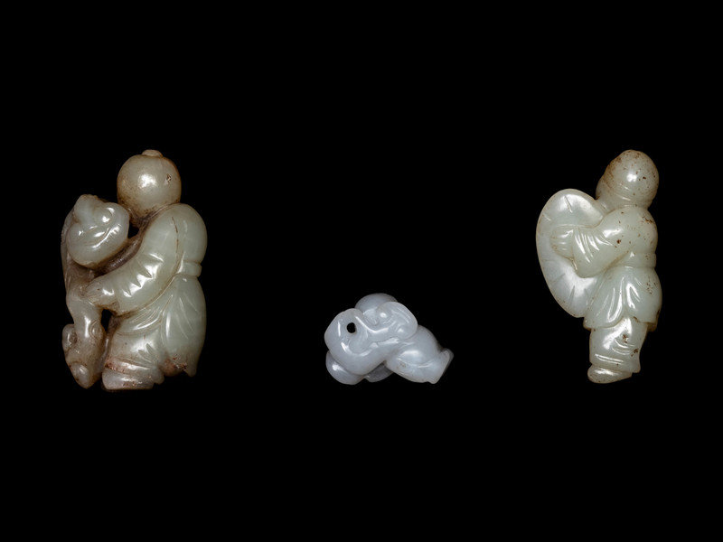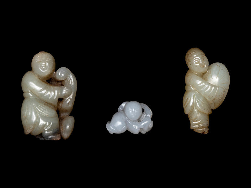Three Chinese Celadon and White Jade Carved Figures of Boys