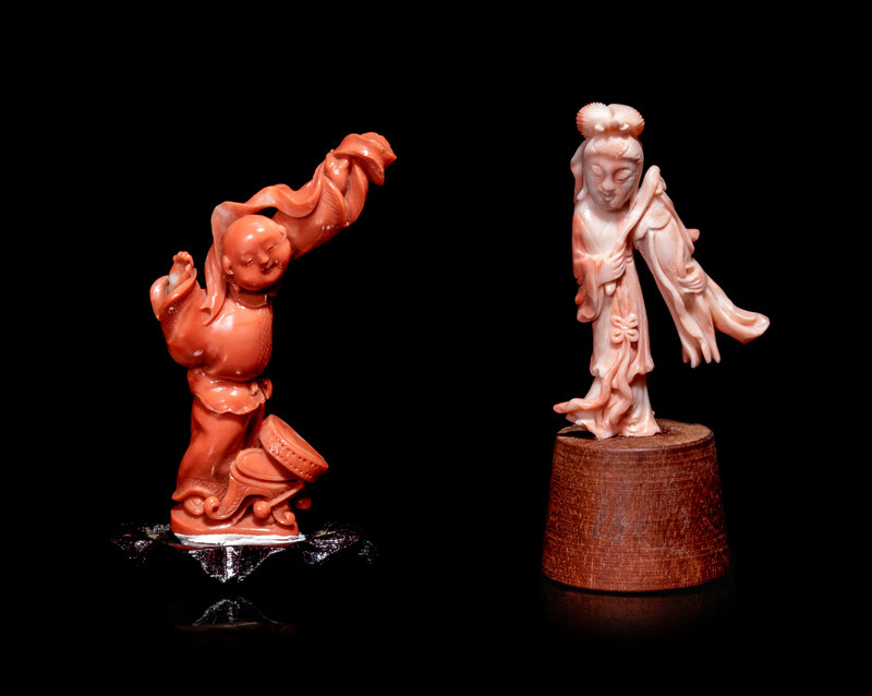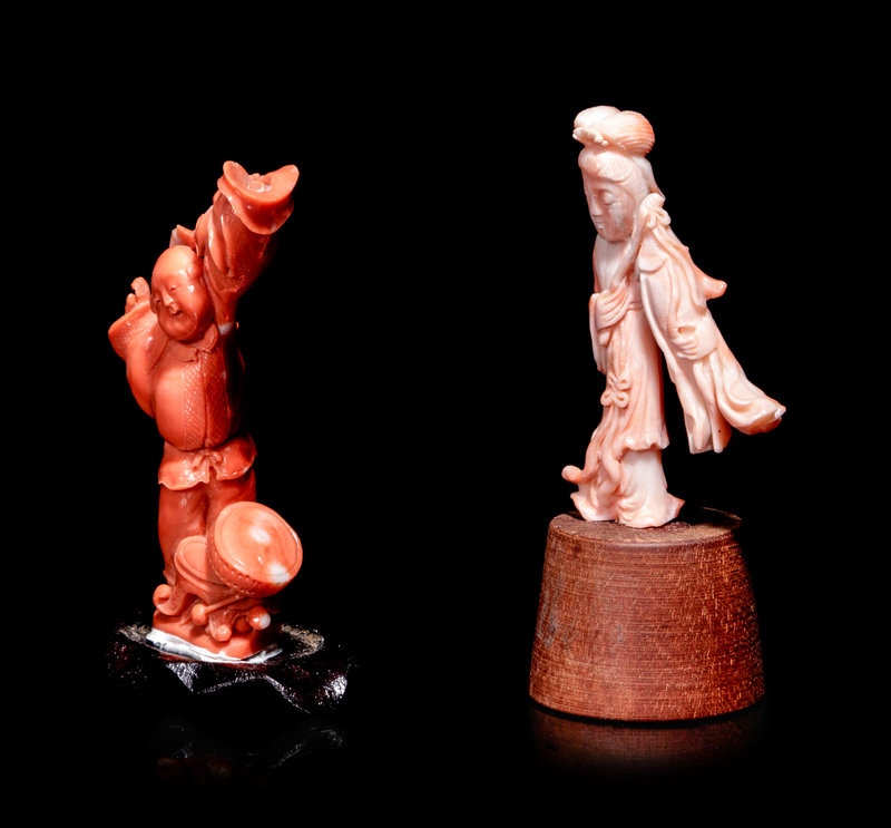 the first a red coral example, carved to show a playful boy; the second a pink coral example, showing a female immortal.