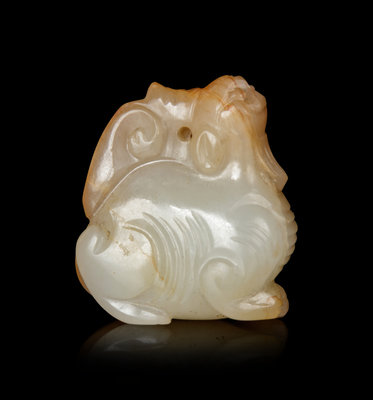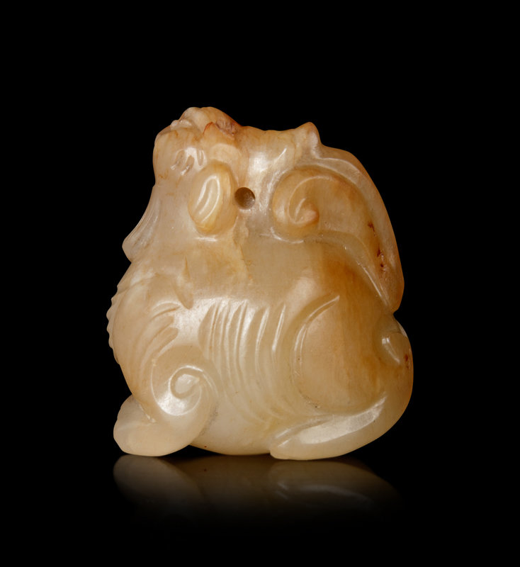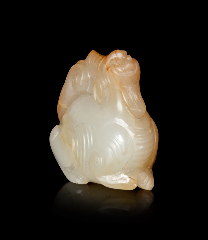 the stone of a light yellow tone with russet inclusions, carved as a recumbent ram with the head raised.