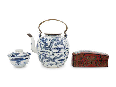 comprising a metal handled teapot, a tea bowl and cover, and a porcelain plaque inset tianqi lacquered box and cover.