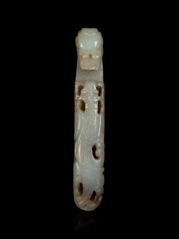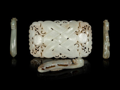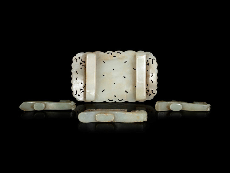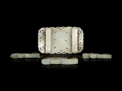 comprising three celadon jade chilong belt hooks, and one rectangular form reticulated white jade belt buckle.