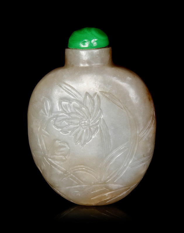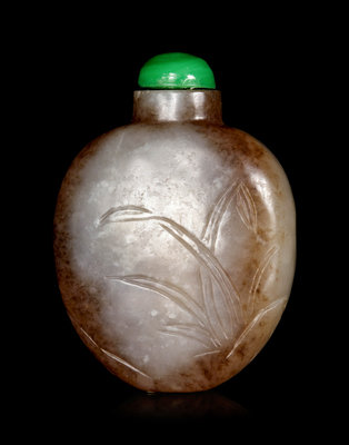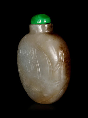 A Chinese Russet and Celadon Jade ‘Floral’ Snuff Bottle