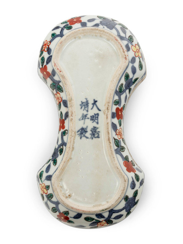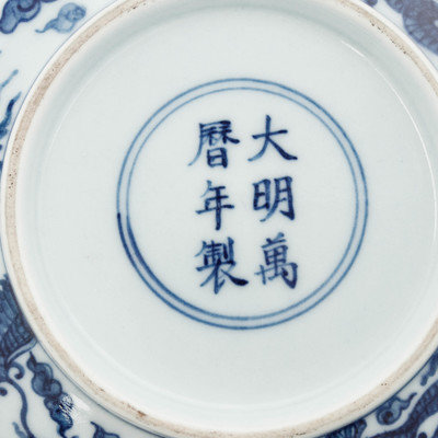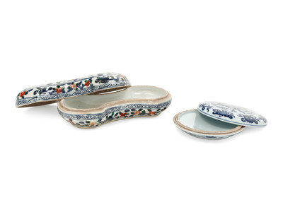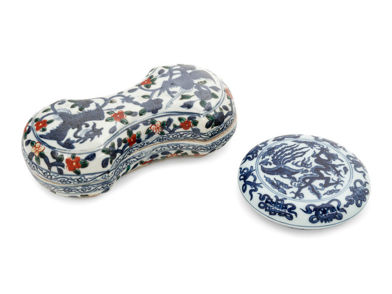 comprising a waisted form example and a circular example, each decorated in cobalt blue with floral scrolls and birds.