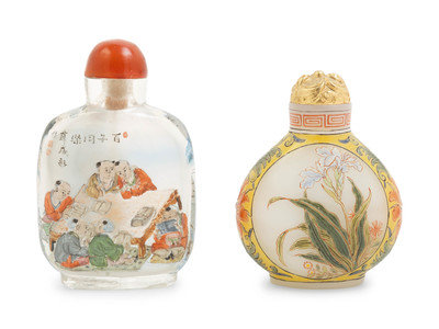 the first an inside painted example, depicting boys reading books, the second an enamel on white glass example, painted with orchids.