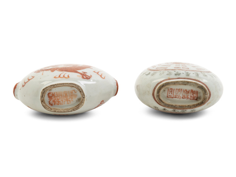comprising an flattened bell form example, a circular example painted with iron-red dragons, a cylindrical example painted with roosters, a circular example painted with the Eight Diagrams, and an oval-shape example depicting Liu Hai.