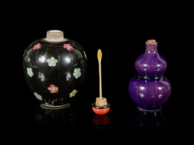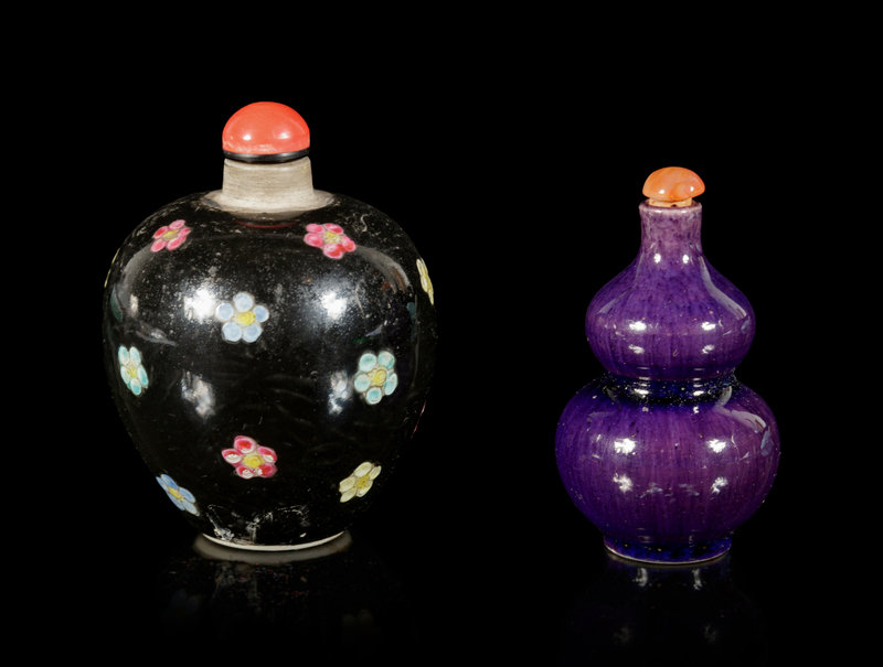 the first a black ground example painted with flowers, the second a double-gourd form example applied with purple glaze.