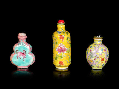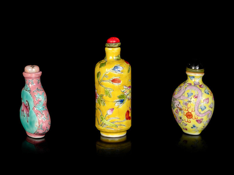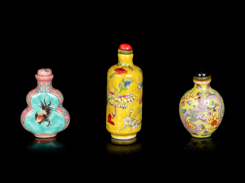 comprising a yellow ground famille rose ‘floral’ bottle, a pink and turquoise ground ‘rooster and horse’ gourd-form bottle and a yellow ground famille rose ‘dragon’ bottle.