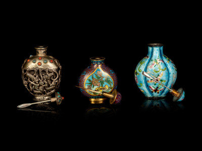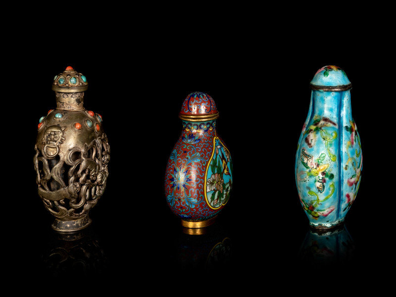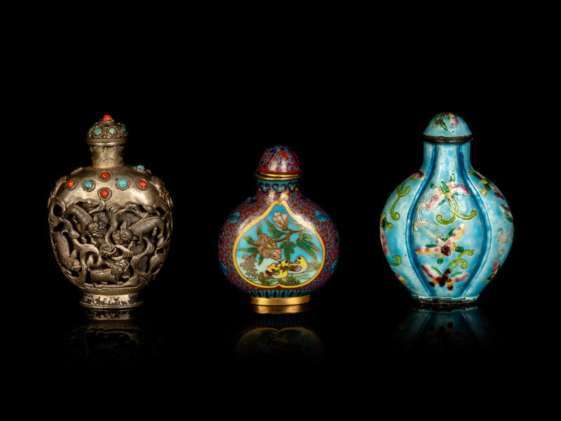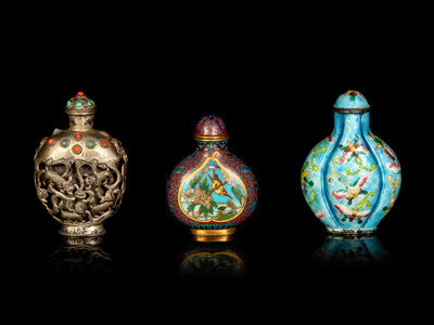 comprising a Mongolian hardstone silver bottle, an enameled on metal ‘floral and butterflies’ lobed bottle and a cloisonné enamel ‘birds and floral’ bottle.