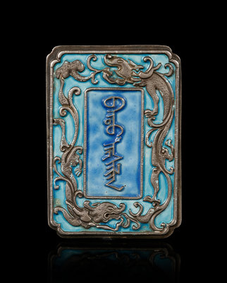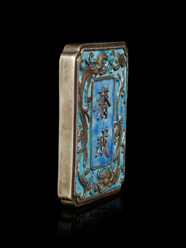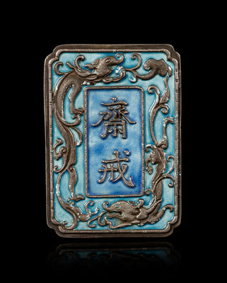of rectangular form with canted corners, the front centered with a rectangular panel chased with two characters, zhaijie (restraint), enclosed by two kuilongs, the same characters repeated in Manchu on the reverse.