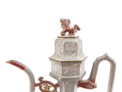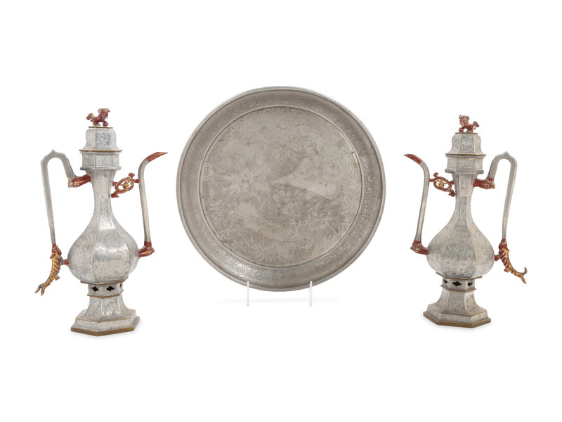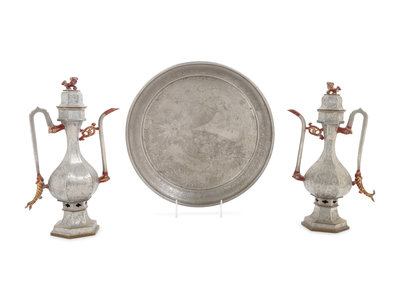 A Pair of Chinese Pewter Wine Ewers and a Chinese Pewter Circular Tray