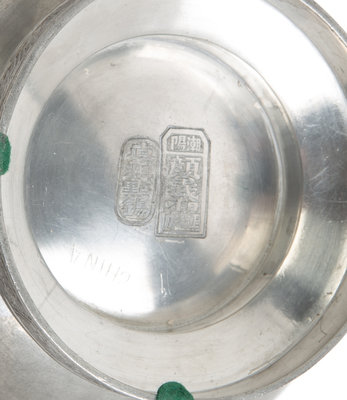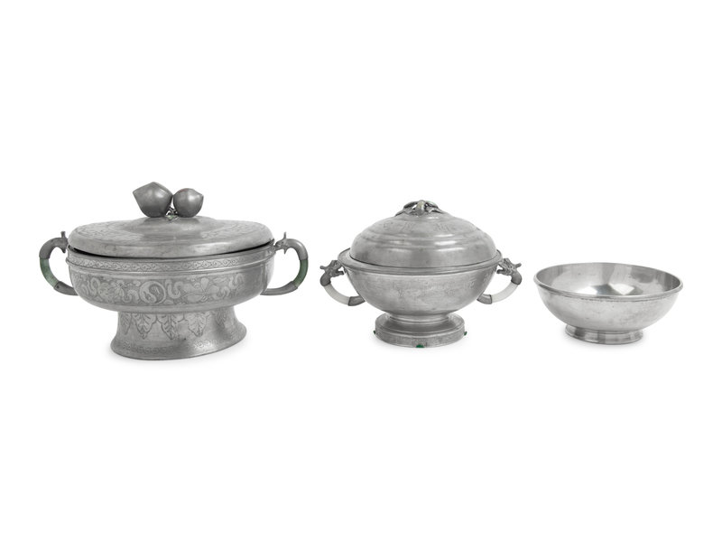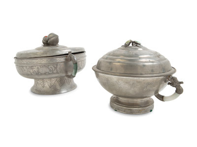Two Chinese Hardstone Inset Pewter Pots and Covers