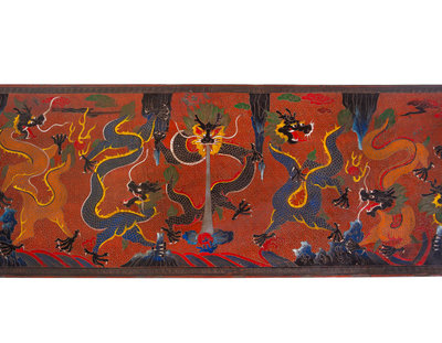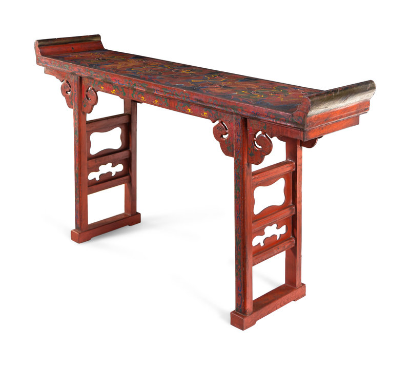 the table with a rectangular top panel decorated with dragons in various colors, all on a ground of repeated geometric patterns.