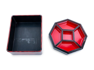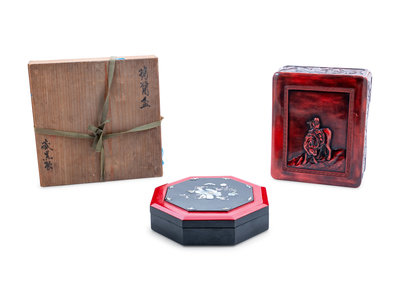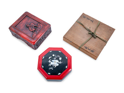 comprising a circular tray, a rectangular box and cover and an octagonal box and cover.
