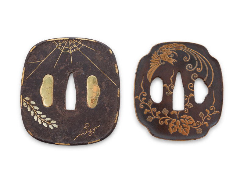 the first an iron example, of rectangular form, inlaid in gold and bronze showing leafy vines and a spider web, signed; the second a bronze example, of quatrefoil form, inlaid in gilt bronze showing leafy branches, unsigned.